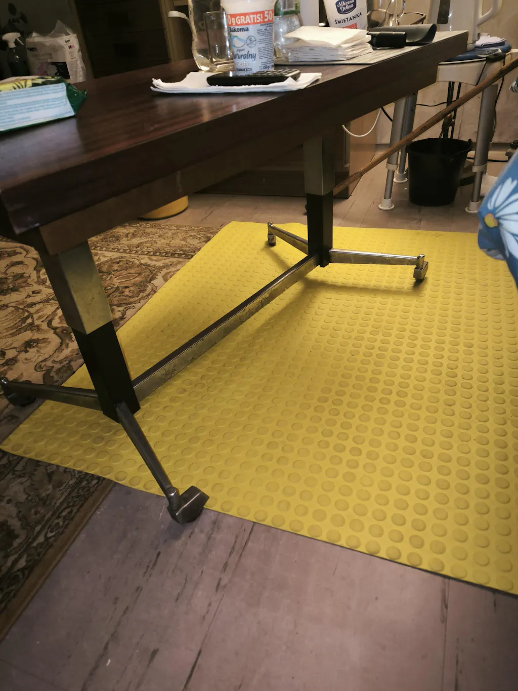 Dzeltena gumijas grīdas seguma izstrādājums, izgatavots no modernā TPE (termoplastiskā elastomēra) materiāla, apvieno elastību, izturību un augstu lietošanas komfortu. Virsma ar raksturīgo monētu rakstu (apaļas izvirzījumi) efektīvi palielina saķeri, samazinot slīdēšanas risku pat sarežģītos apstākļos.